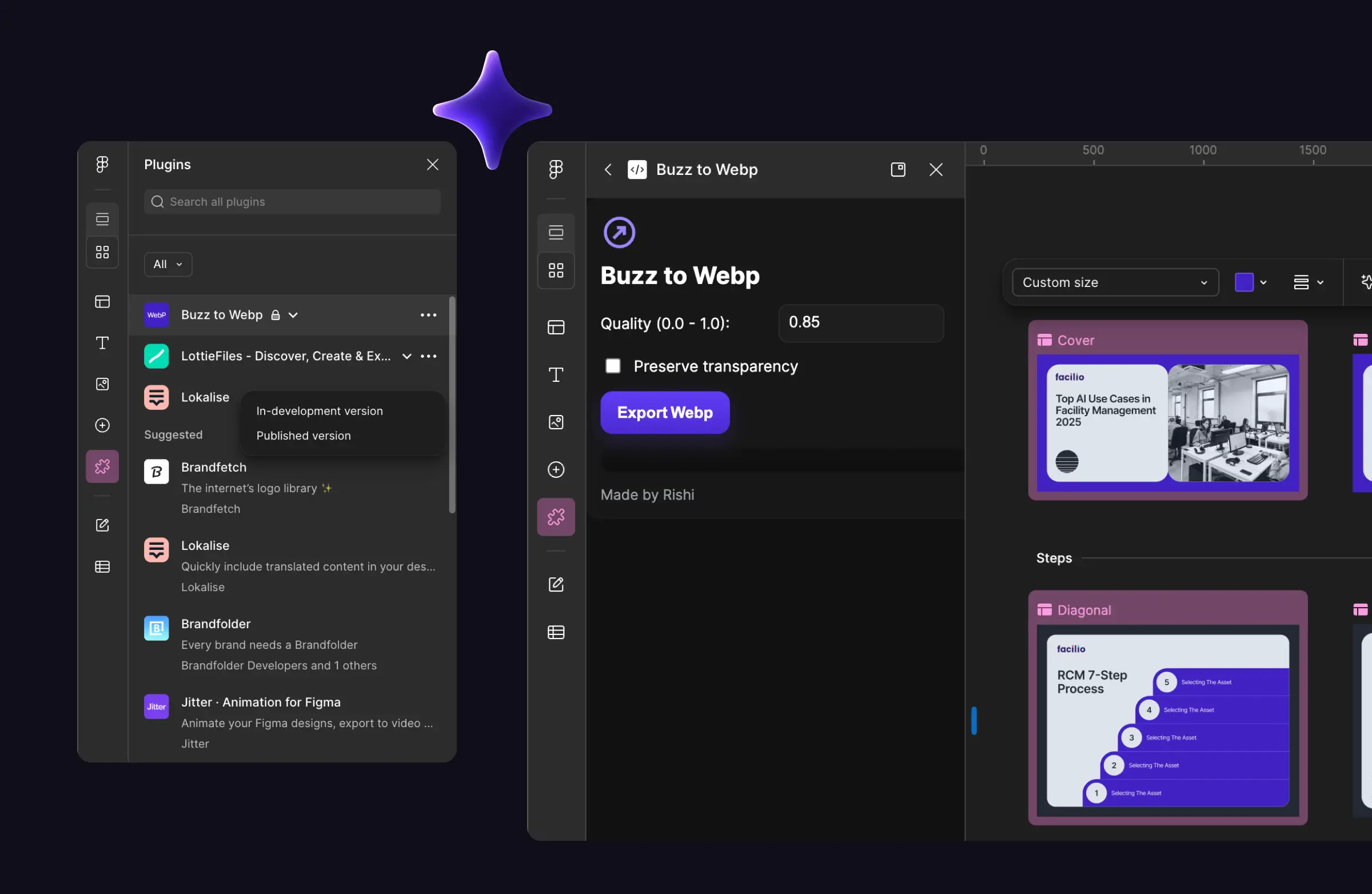 Figma Buzz didn't support plugins the way standard Figma does. Since no existing Webp export plugin worked within Buzz, I used ChatGPT to help me write a custom plugin from scratch. The plugin worked, it allowed to control quality and single/multiple (zipped file) Webp export direct from Buzz, removing the need for any post-export conversion step that marketers wouldn't know how to handle.