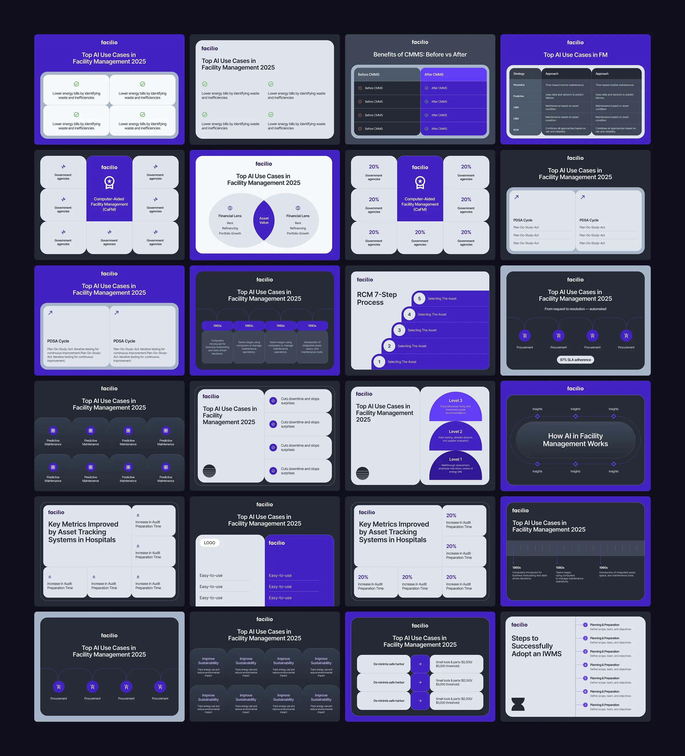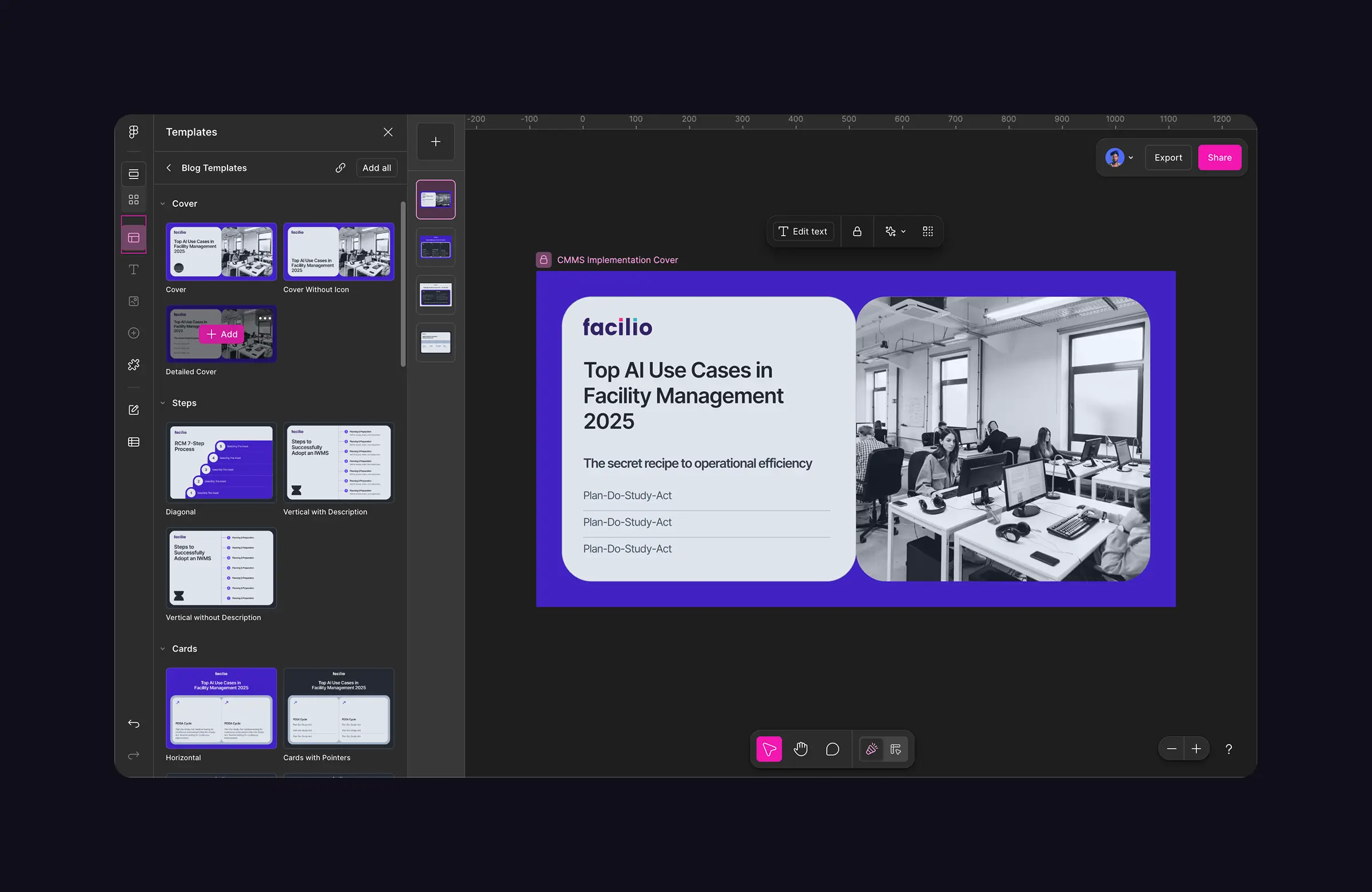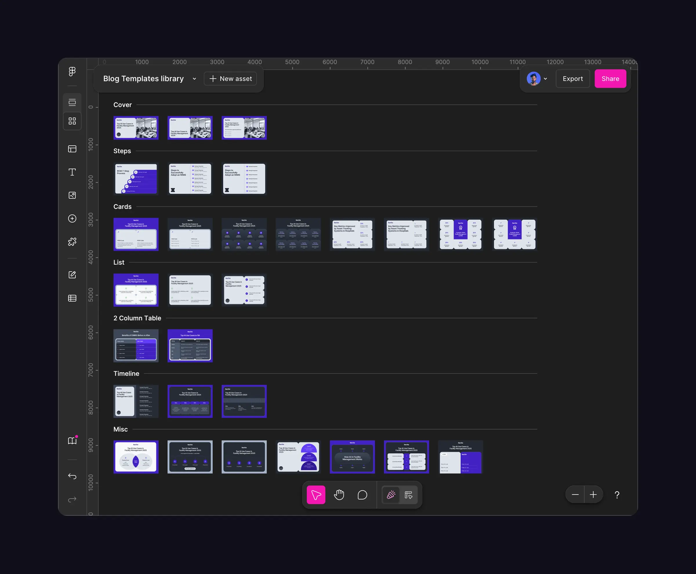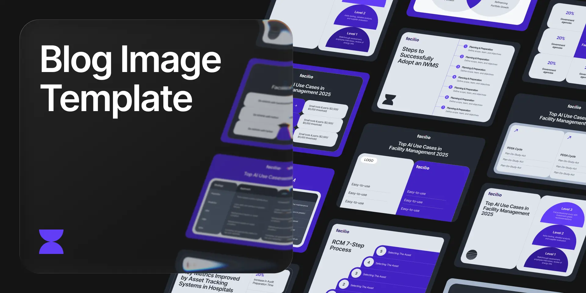 A reusable blog image template system built in Figma Buzz to accelerate content production for Facilio's marketing team. The system covers all recurring blog image categories from tables, cards, timelines, steps, lists, and more, with pre-built variations that designers and marketers can quickly customize and export, without starting from scratch every time.